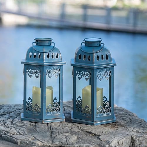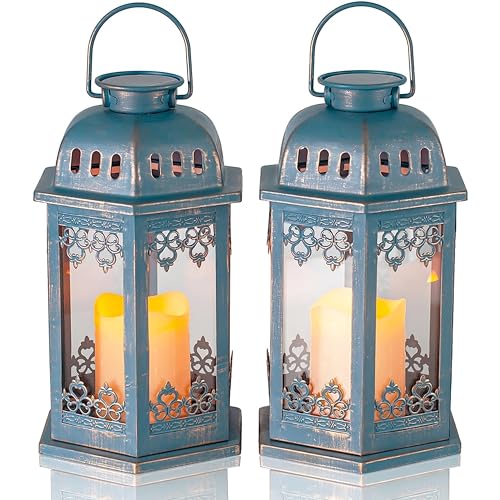 SteadyDoggie Lot de 2 lanternes solaires bleues à suspendre avec bougie vacillante LED – Lanterne solaire rétro décorée avec poignée