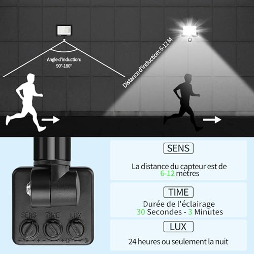 【Mise à niveau du capteur infrarouge】il détecte les derniers mouvements et prolonge automatiquement le temps d’éclairage, donc nous vous recommandons de ne pas fixer le temps d’éclairage trop longtemps pour économiser de l’électricité. Temps (durée de l’éclairage 30 secondes – 3 minutes), sens (distance du capteur 6 – 12 mètres) et lux (jour et nuit).
