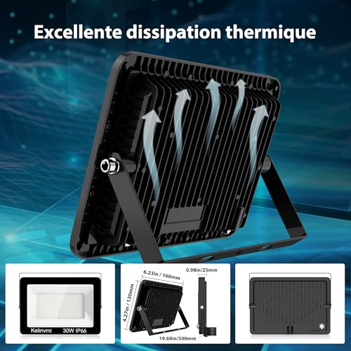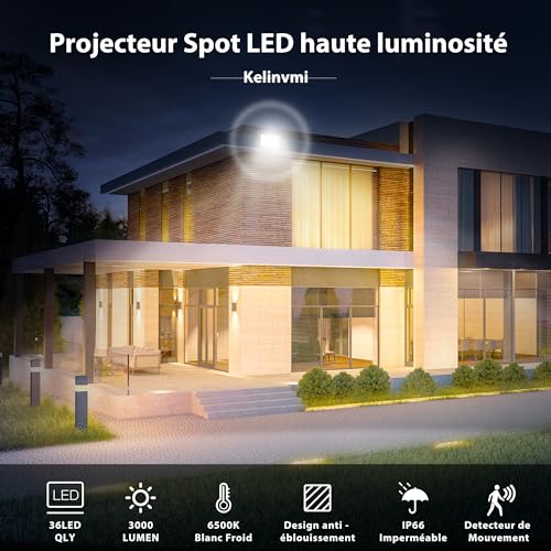 kelinvmi 30W Projecteur LED Exterieur Detecteur de Mouvement, 3000lm LED Éclairage de Sécurité Extérieur, 6500K Blanc Froid IP66 Imperméable Spot LED Extérieur pour Jardin, Patio, Garage, Entrée.