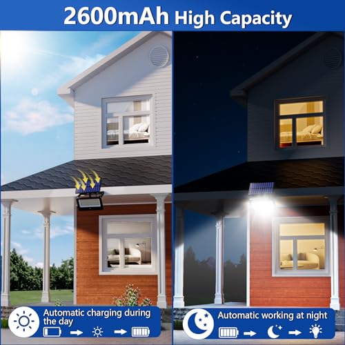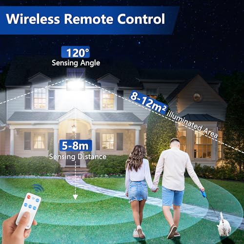 Realky Lampe Solaire Exterieur Détecteur de Mouvement, 4 Modes/2600mAH Projecteur Exterieur LED Solaire Avec Télécommande, IP65 Étanche Lampe Solaire Exterieur Jardin pour Garage, Patio, Cour