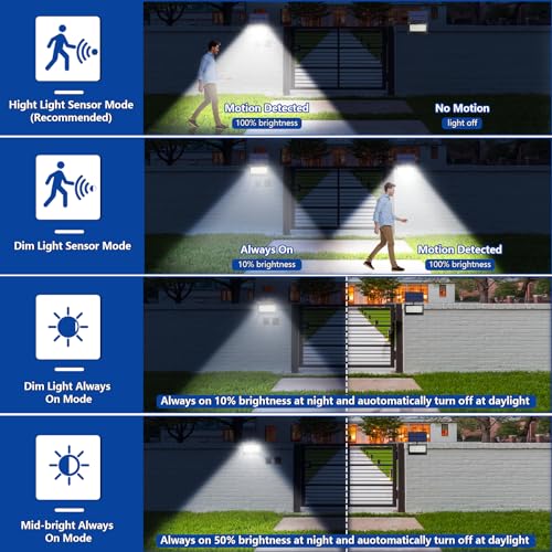 🌟Détection de Mouvement & 4 Modes: 4 Modes : Mode 1 : Lorsqu’un mouvement est détecté, elle passe à une luminosité de 100% pendant 30 secondes avant de revenir à une luminosité faible (10%). Mode 2 : Lorsqu’un mouvement est détecté, la lampe s’allume à 100% de luminosité et s’éteint après 30 secondes. Mode 3 : Elle s’allume à une faible luminosité (10%) la nuit et s’éteint à l’aube. Mode 4 : Elle s’allume à 50% de luminosité la nuit et s’éteint à l’aube (ou lorsque la batterie est épuisée).