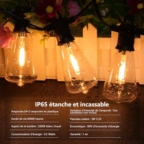 ZOTOYI Guirlande Solaire Exterieur 15M, ST38 Guirlande Lumineuse Exterieure Solaire Étanche, 24+2 LED Ampoules, 4 Modes Éclairage Guirlande Solaire pour Jardin Porche Terrasse Noël Fête, 2200K