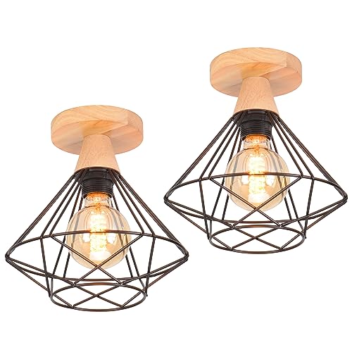 iDEGU Lot de 2 Plafonniers Industriels, 22CM Vintage Luminaire E27 Rétro Lustre Suspension en Bois et Fer Design Cage Noir Lampe de Plafond pour Salon Couloir Chambre Cuisine