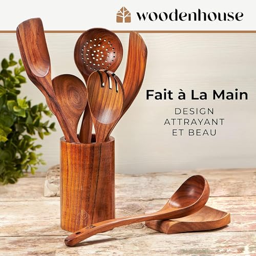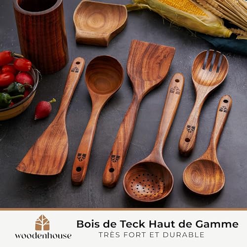 Ustensiles en Bois de Teck avec Support et Repose Cuillère – Cuillères et Spatule pour la Cuisine – Naturels et Sains Antiadhésifs – Ensemble 13 Pièces