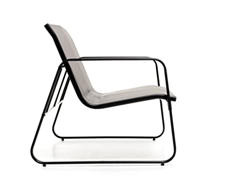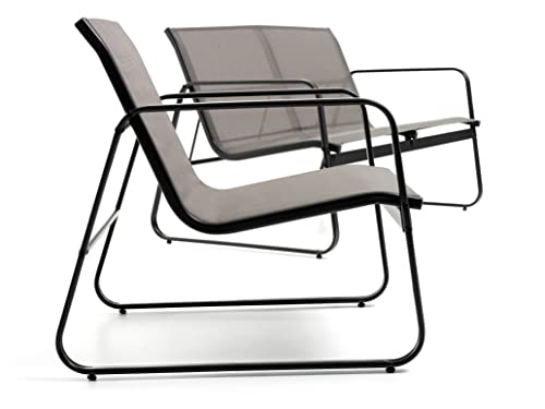 Salon lounge 4 places composé d’un canapé 2 places, 2 fauteuils et table basse. Structure en tube de fer, section ovale, revêtement par poudre époxy de couleur anthracite, plateau de la table basse en verre trempé décoré de couleur anthracite, revêtement assise et dossier en textilène gris. Dimensions : : canapé 113 x 80 x 77 cm ; fauteuil 61 x 80 x 77 cm ; table basse 85 x 50 x 39 cm