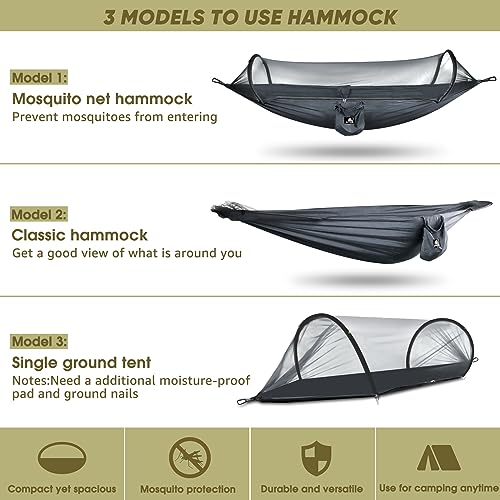 ►SOLIDE POUR FACILITER LE VOYAGE, LE CAMPING ET L’INSTALLATION – Lorsque vous avez trouvé le meilleur emplacement de camping, l’installation est un jeu d’enfant. Vous pouvez même suspendre votre hamac entre deux arbres distants de plus de 6 mètres grâce aux deux sangles de 2,8 mètres.Vous n’avez pas besoin d’attacher les cordes pour la moustiquaire.Dès que vous sortez le hamac du sac, la moustiquaire se déploie automatiquement.