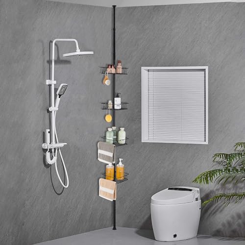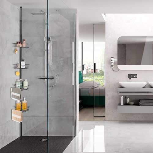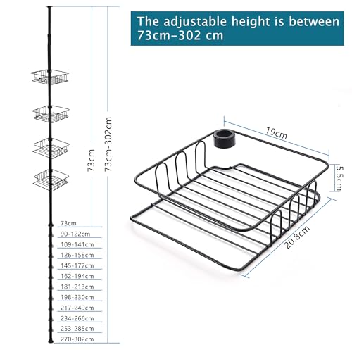 HOUHA Étagère de Douche Télescopique Sans Perçage, Étagère Douche d’angle avec Métal 4 Paniers pour Salle de Bain 73-302CM, Noir