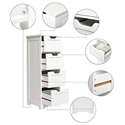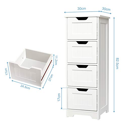 Mondeer – Meuble Salle de Bain – Meuble de Rangement avec 4 Tiroirs en Bois Gain de Place Moderne pour Salle de Bain Salon Couloir Chambre Blanc 30 x 30 x 82 cm H1071BC04WT