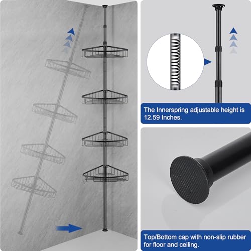 QIUFEN Étagère Salle de Bain Télescopique Etagère de Douche d’angle Sans Perçage, Etagères de Rangement de Salle de Bain avec 4 Paniers pour Salle de Bain, Réglable en Hauteur 73 à 302cm(Noir)