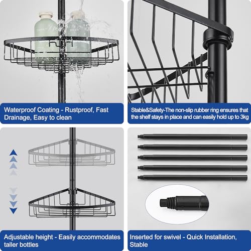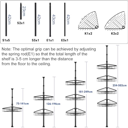 【Un montage facile】Pas besoin d’outils ou de percer. Grâce aux instructions de montage claires, la tablette de douche est facile à monter et réglable en hauteur entre 73 et 302 cm. La charge statique maximale autorisée par tablette est de 3 kg.