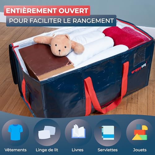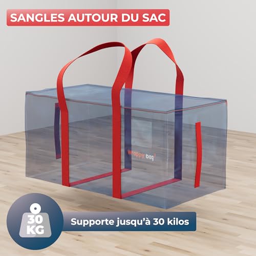 WRAPPYBAG Lot de 4 Grands Sacs de Rangement Plastique – Sacs XXL pour Déménagement & Voyage – Solide, Épais & Étanche avec Poignées Renforcées – pour Vêtement & Linge de Lit – 75 x 36 x 38 cm