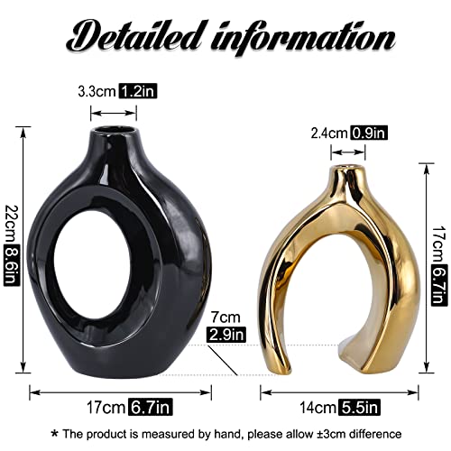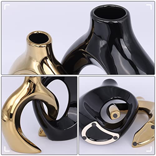 Lot De 2 Vases Creux en CéRamique BohèMe pour DéCoration De La Maison, Vase Beignet, Centre De Table Adapté pour Table De Mariage, FêTe, Salon, Bureau, Chambre à Coucher(Noir + Doré – A)